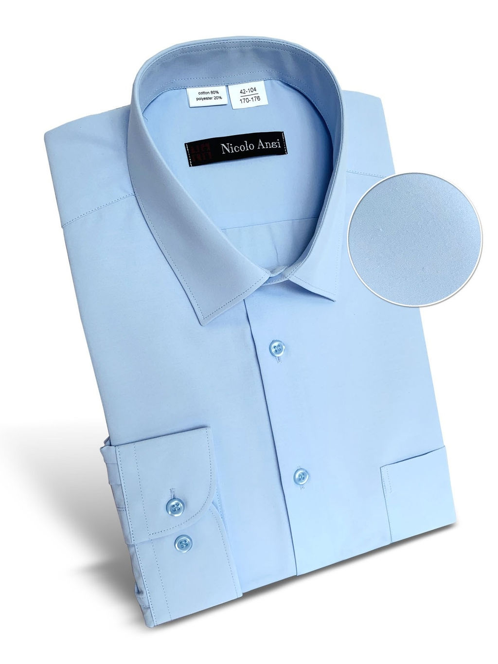 Бренд: Nicolo Angi Длина рукава рубашки: Длинный Карман: 1 карман Силуэт: Большие размеры (classic fit) Состав: 80% хлопок, 20% полиэстер Стиль: Деловой Узор (рисунок): Без рисунка (однотонная) Цвет: Голубой