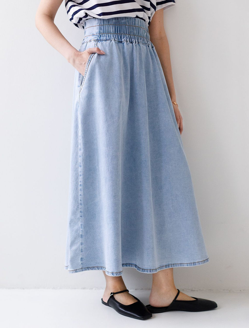 Эффектная юбка миди светло-голубого цвета А силуэта выполнена из облегченного денима плотностью 8 OZ и идеально подойдет для весны и лета. После пошива изделие подвергли специальному виду вошинга salt-stone washing (солт-стоун вошинг), что дословно значит стирка с каменной солью. Такой вид вошинга позволяет получить стильные потертости на голубых оттенках денима. Особенность модели широкий пояс на мягкой резинке, который гарантирует удобство в области талии. Мягкий дышащий хлопок почти не ощущается на теле, обеспечивая отличную терморегуляцию в летний период. Совободная юбка идеально подойдет для девушек и женщин размера plus size (плюс-сайз)с широкими бедрами, скроет недостатки и подчеркнет достоинства фигуры. Благодаря универсальному фасону расклешенная юбка подходит на высокий и низкий рост. Невероятно женственная юбка добавит любому образу романтичности. Повседневная джинсовая юбка с карманами по бокам практична и незаменима в современном гардеробе. Универсальную широкую юбку можно сочетать с разными верхами от классических до кэжуал. Такая стильная юбка станет базовой вещью, способной подчеркнуть индивидуальность и чувство стиля без лишних усилий. Рекомендуем сочетать с артикулами: D59.022 -- Характеристики -- Состав: 80%Хлопок 18%ПЭ 2%ПУ Плотность: 8 OZ