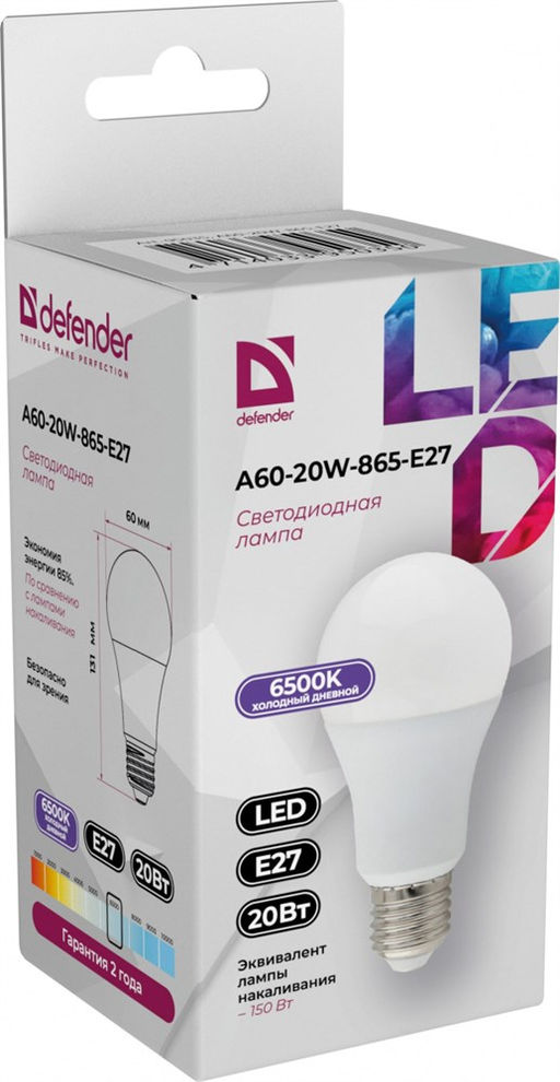 • Лампа светодиодная, E27, A60, 20Вт, 4000К "Defender" нейтральный белый свет
