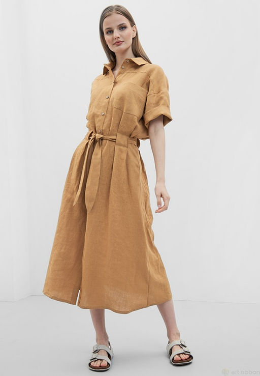 Платье свободного кроя с центральной застежкой на петли и пуговицы, и с карманами в боковых швах. Воротник рубашечного типа, рукав короткий, спущенный. Съемный пояс фиксируется на изделии через сквозные шлевки. Возможно отличие фотографии по оттенку, связанное с разной цветопередачей монитора.