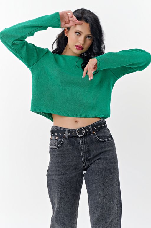 Особенности:  Вязаный укороченый джемпер с содержанием хлопка. Силуэт свободный, прямой. Горловина по типу "лодка" окантован под закрутку.