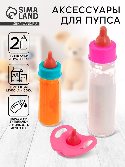 • Аксессуары для пупса «Волшебная бутылочка», набор 2 бутылочки и пустышка, МИКС
