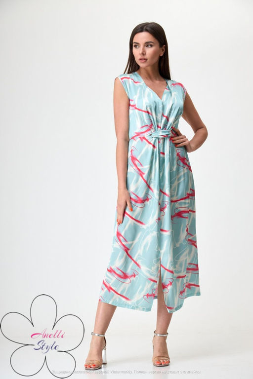 Платье женское прямого силуэта, чуть расширенное к низу, длина миди. По переду V-образный вырез горловины, по линии талии декоративный узел подчеркивающий вашу грудь. Для удобства передвижения разрез в среднем шве по переду. Линия талии спинки на резинке. Дизайнерский принт, актуальная расцветка, лёгкость, женственной и комфорт. Вся необходимая информация о производителе указана на этикетке.