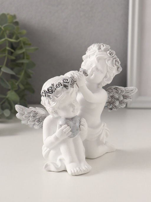 • Фигурка полистоун Ангелочки вплетают венок в волосы, с сердцем, бело-серый, 11?8?12.5 см