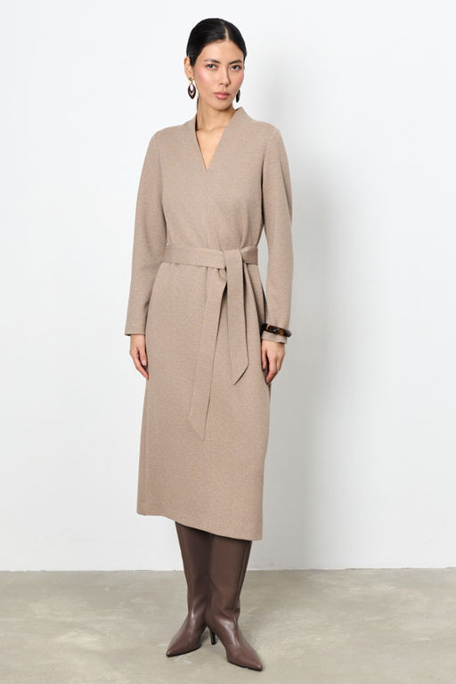 Платье из эластичного полотна свободного силуэта. По центру передней части изделия выполнен шов. Цельнокроеная стойка, переходящая в V-образный вырез горловины, визуально делает фигуру стройнее. Втачной длинный рукав. В комплекте - пояс из основной ткани.