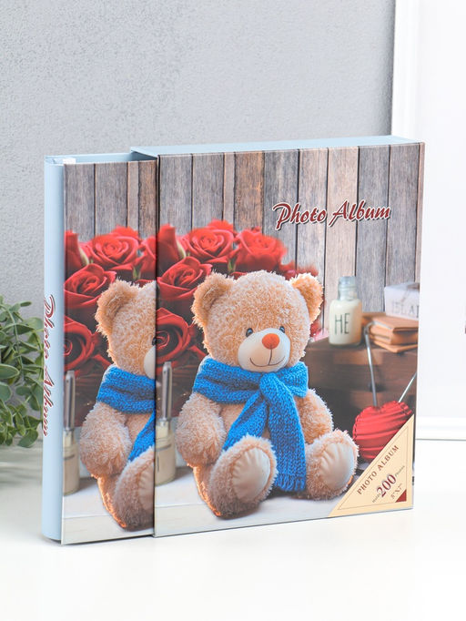 Фотоальбом на 200 фото 13х18 см "Медведь в синем шарфе и розы" в коробке 5,5х23,5х29,5 см