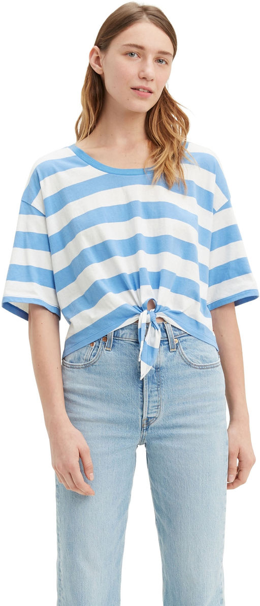 Женская футболка в полоску укороченного кроя. Расслабленный фасон, просторные рукава до локтя, заявязки на талии для регулировки посадки.
