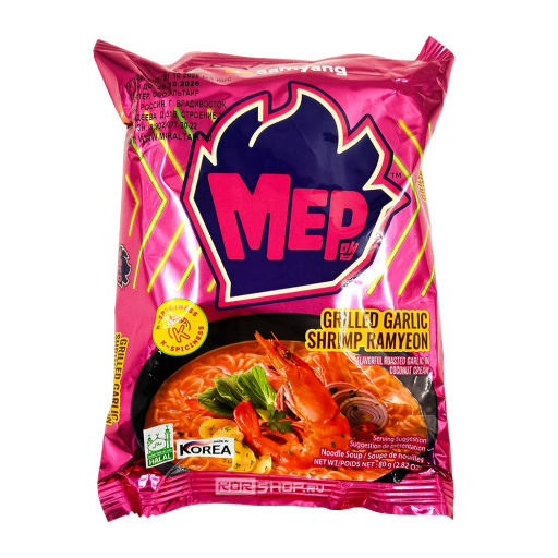 Лапша б/п со вкусом креветок и жареного на гриле чеснока Grilled Garlic Shrimp Ramyeon MEP Samyang отличается особым вкусом благодаря уникальной комбинации ингредиентов. Обжаренный на гриле чеснок привносит в бульон для лапши пикантные дымчатые оттенки и тонкую остроту. Экстракты морепродуктов (креветок и моллюсков) придают вкусу глубину и уникальные вкусовые оттенки даров моря. Кокосовое молоко смягчает букет вкусов, придавая бульону кремовую текстуру и усиливая богатую палитру ароматов, а сливки наделяют его особой нежностью. Благодаря черному перцу блюдо приобретает приятную согревающую теплоту. Лапшу нужно отварить в воде вместе с приправой 4 минуты и восхитительный азиатский суп-лапша готов.