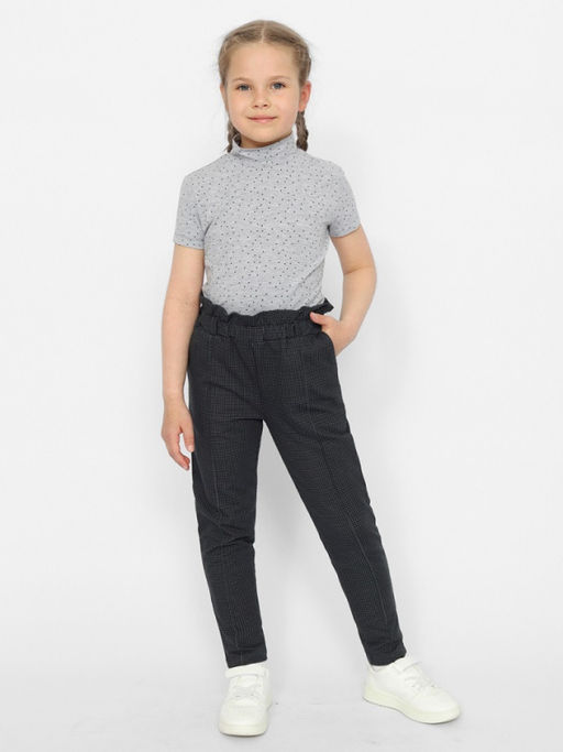 Брюки с высокой посадкой и боковыми карманами. Пояс из основного полотна, отрезной, широкий, с резинкой внутри и шлевками снаружи. Передние половинки брюк с декоративными вертикальными строчками.
