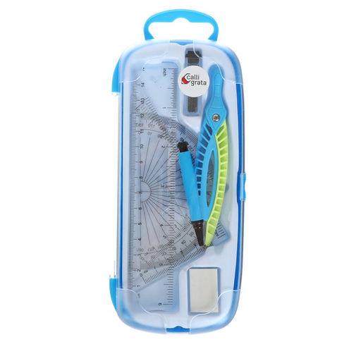 • Готовальня 7 предметов: циркуль 115 мм, грифели, ластик, линейка 15 см, 2 угольника, транспортир