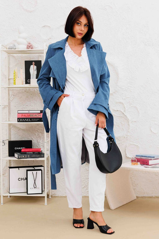 Тренч выполнен из денима, на подкладке. Рукав втачной, к низу расклешенный.  По переднем половинкам обработана пелерина. Застежка на  пуговицы, сьёмный пояс из основной ткани.­