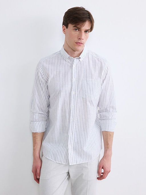 • Regular Fit ?izgili Erkek Keten Kar???ml? G?mlek