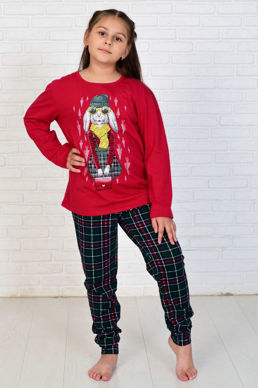 Подростковая хлопковая пижама, футболка с длинным рукавом на манжете, на полочке новогодний принт. Брюки заужены к низу на манжете, пояс на резинке. Длина футболки: 36-51 см, 38-54 см, 40-57 см. Длина рукава: 36-47 см, 38-50 см, 40-53 см. Длина брюк по боковому шву: 36-62 см, 38-70 см, 40-75 см. Длина брюк по шаговому шву: 36-62 см, 38-70 см, 40-75 см. Подкладки нет. Застежки нет. Плотность ткани: тонкая. Уход: машинная стирка 30 градусов отдельно от других вещей.