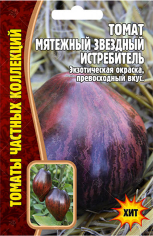 Томат «Мятежный Звёздный Истребитель» — многократный победитель разнообразных выставок. Сорт среднеспелый, высокорослый. Высота куста может быть в теплице до 1.8 метра. Плоды оригинальной формы-сердцевидные с носиком. Окраска помидоров необычная, полосатая, от темно-розовой до фиолетовой. Мякоть сочная, очень вкусная, розового цвета. Вес 150-200 грамм (отдельные до 400 г.)