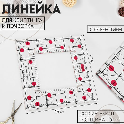 • Линейка для квилтинга и пэчворка, с отверстием, 15×15 см, толщина 3 мм, цвет прозрачный/розовый