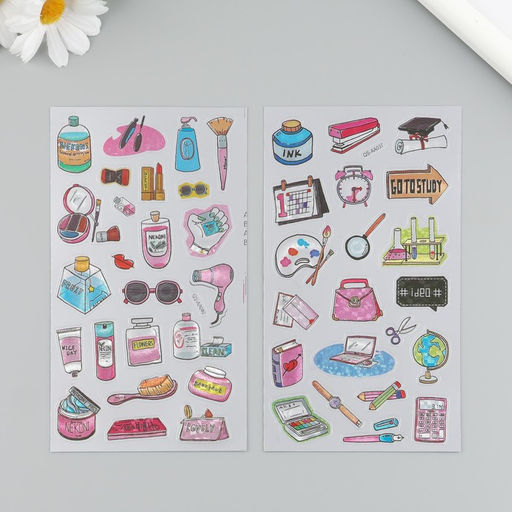 Цена за 3 шт. Наклейка пластик "Косметика/Учебный процесс" МИКС 9,5х17,5 см
