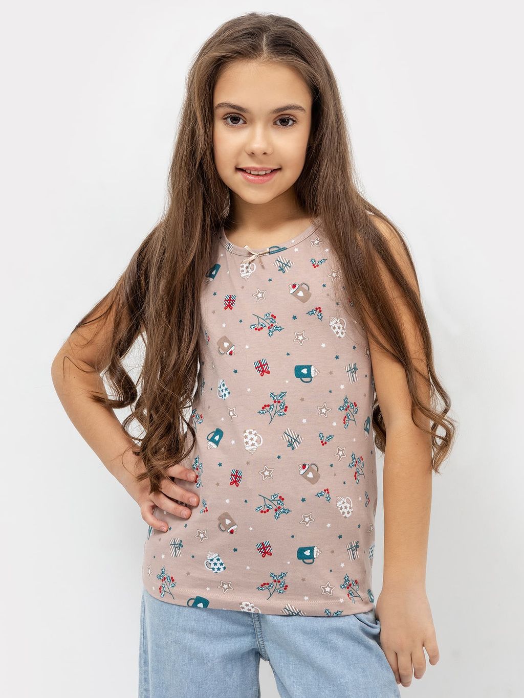 Майка для девочек, выполненная из трикотажной кулирки. Длина до середины бедер. Силуэт полуприлегающий. Горловина круглая. Универсальная майка!
