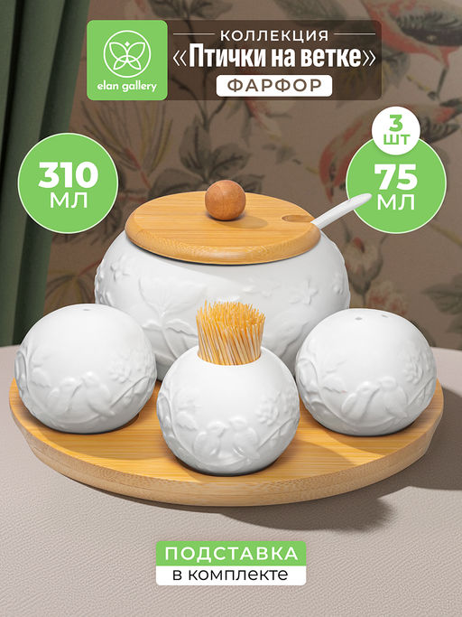 Набор посуды на деревянной подставке из серии Птички на ветке от Elan Gallery предназначен для эстетичной сервировки вашего стола. Включает в себя сахарницу с ложкой, вазочку под зубочистки и набор для специй. Выполнены из высококачественного белого фарфора. Он не впитывает цвет продуктов и легко отмывается, благодаря чему надолго сохраняет свою белизну. Подставка и крышка сахарницы выполнены из натурального бамбука. Размер подставки 20,5х20,5х1 см. комплект станет воплощением прекрасного вкуса. Поверхность изделий украшает рельефный рисунок в виде лиственных веточек, на которых сидят птички. Размер сахарницы 11х11х9,5 см, объём 310 мл. Подойдёт для сахара, соли, а также для специй и приправ. Засыпьте внутрь чай или кофе, чтобы в любой момент заварить свежий напиток. Эстетичную ёмкость также можно приспособить под варенье, мёд или икру. Ложечка размером 13х2,5 см позволит удобно набрать необходимое количество продуктов. Она компактно помещается в баночке благодаря выемке на крышке. Такое изделие отлично дополнит сервировку стола как для сытного завтрака, так и для уютного чаепития. Размер каждой маленькой ёмкости 6х6х5 см, объём 75 мл. Набор для специй позволит держать под рукой необходимые приправы. Наполняются через отверстие снизу и закрываются пластиковой пробкой. Вазочка для зубочисток станет удобной гигиенической принадлежностью. Зубочистки не входят в комплект. Не рекомендуется применять абразивные моющие средства. Без бамбуковых и пластиковых элементов подходят для использования в посудомоечной машине и микроволновой печи. Бамбук нельзя замачивать! Поставляются в дизайнерской картонной коробке благодаря ей вам не потребуется дополнительная подарочная упаковка. Фарфоровая сервировочная посуда будет оригинальным подарком для хозяйки, ценящей не только практичность, но и привлекательность. Серия Птички на ветке от бренда Элан Галерея станет украшением любого кухонного инвентаря и позволит собрать красивый сервиз в едином стиле!