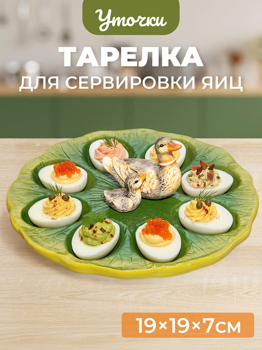Тарелка для фаршированных яиц Уточка предназначена для эстетичной сервировки вашего стола. Размер изделия 19,5х19,5х7,5 см. Высота без учёта фигурок 2,5 см. Выполнена из керамики в виде зелёного листа с фигурками большой и маленькой уточек. Фигурки не съёмные! Используйте блюдо для необычной подачи фаршированных яиц и других угощений. Используйте в качестве небольшой менажницы и создайте композицию по своему вкусу, чтобы преобразить как повседневный, так и праздничный стол! Не рекомендуется применять абразивные моющие средства. Не подходит для использования в посудомоечной машине и микроволновой печи. Поставляется в дизайнерской картонной коробке благодаря ей вам не потребуется дополнительная подарочная упаковка. В коллекции бренда Элан Галерея представлен богатый выбор декоративной посуды и красивых сувениров каждый обязательно подберёт вариант на свой вкус. Они станут оригинальным подарком для родных, близких и коллег. Преобразите пространство вокруг себя, наполнив его неповторимым очарованием!