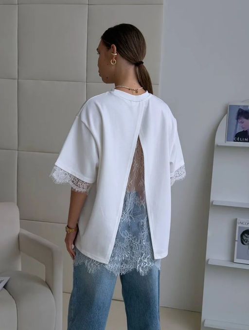 K13425 Футболка с кружевом OVER SIZE (хлопок) БЕЛЫЙ