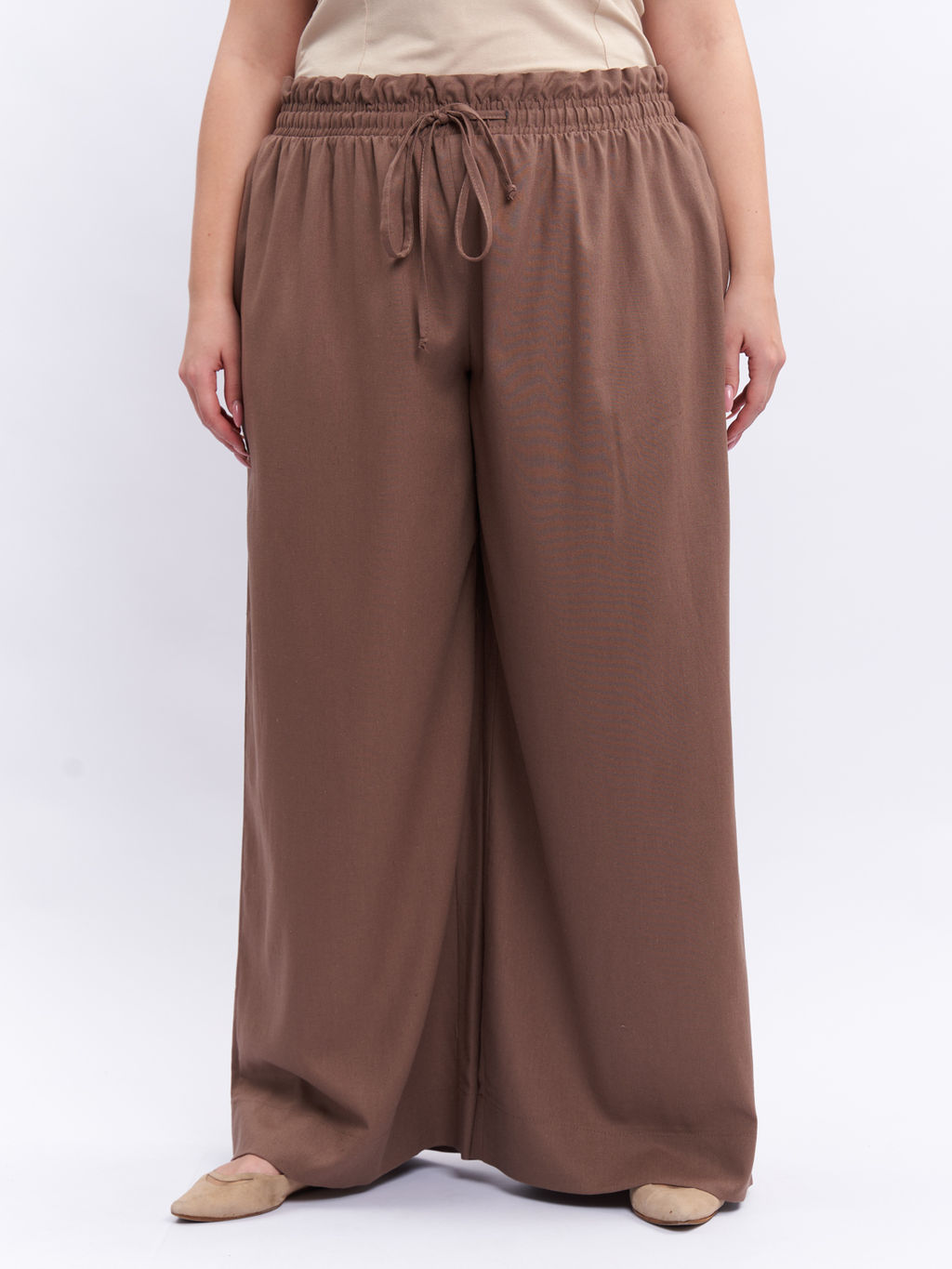 Женские льняные брюки больших размеров бежевые Штаны выполнены из натурального льна в сочетании с вискозой, что обеспечивает легкость и хорошую воздухопроницаемость важные качества для тёплого времени года. Свободный прямой крой в стиле палаццо помогает скрыть особенности фигуры и подчёркивает женственность. Пояс с кулиской на резинке позволяет отрегулировать посадку по фигуре, а боковые карманы добавляют удобство и практичность. Модель выполнена в модном оверсайз формате, специально созданном для девушек plus size, чтобы гармонично подчеркнуть достоинства и обеспечить свободу движений. Эти базовые брюки телесного оттенка идеально подходят для стильных повседневных образов в стиле плюс сайз, сочетая комфорт и актуальный дизайн. Как выбрать размер -- Характеристики -- Сезон: Лето Материал: Лён Состав?01) 100% хлопок 02) 95% хлопок, 5% эластан 03) 60% вискоза, 40% хлопок 04) 60% вискоза, 40% хлопок 05) 75% хлопок, 25% полиэстер 06) 50% вискоза, 35% полиэстер, 10% шерсть, 5% эластан 07) 65% полиэстер, 25% вискоза, 10% эластан: 70% вискоза, 30% лён Цвет: бежевый Принт: однотонный Стиль: Для полных, Повседневный Силуэт: А-силуэт Особенности: большие размеры, для полных, оверсайз Карманы: В шве Застежка: Кулиска, Резинка Стирка: Деликатный режим, не более 30 градусов, без барабанной сушки Страна производства: Россия В наличии: Да