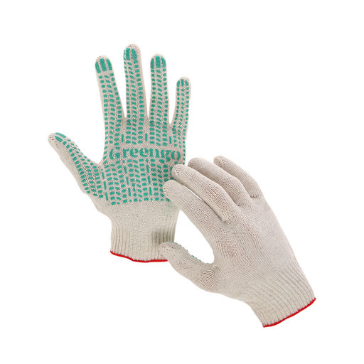 Цена за 10 шт. Перчатки садовые, хб, вязка 10 класс, 4 нити, размер 9, с ПВХ точками, белые, Greengo