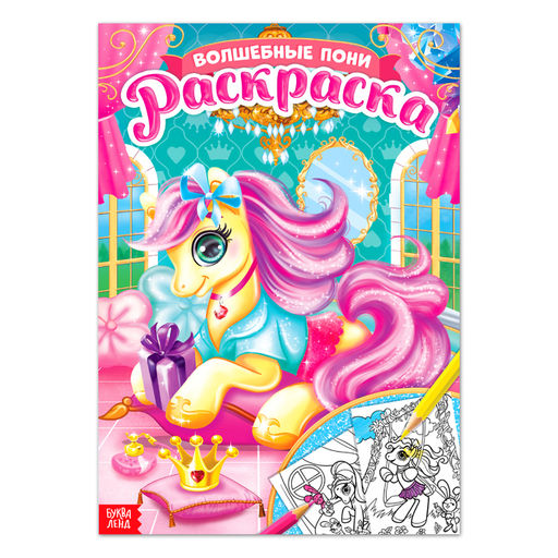 Раскраска Волшебные пони книга с контурными картинками единорожек. Малышка сможет их раскрасить карандашами, красками или фломастерами. Страницы и обложка выполнены из бумаги.