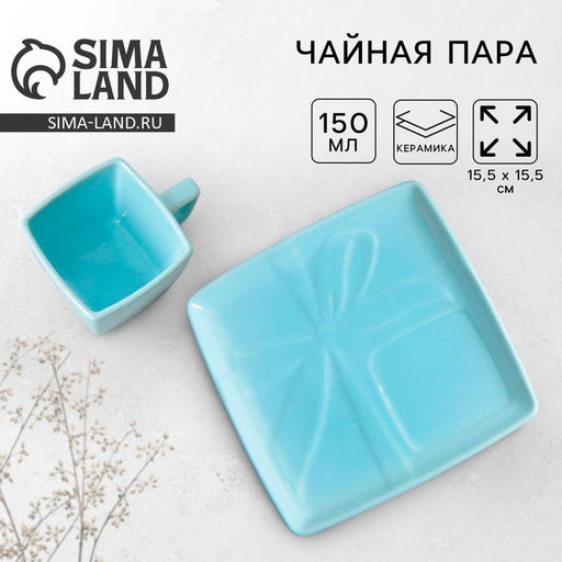 Чайная пара керамическая «Голубой подарок»: кружка 150 мл, блюдце 15.5×15.5 см