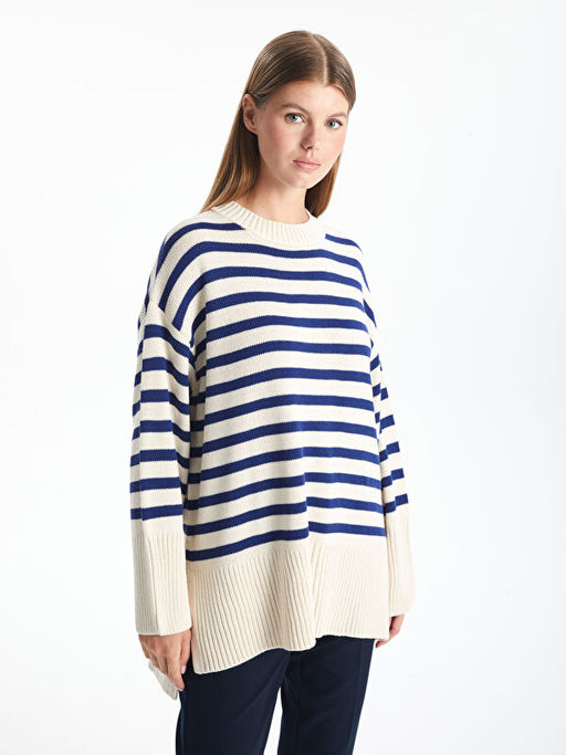 Bisiklet Yaka ?izgili Oversize Kad?n Triko Kazak