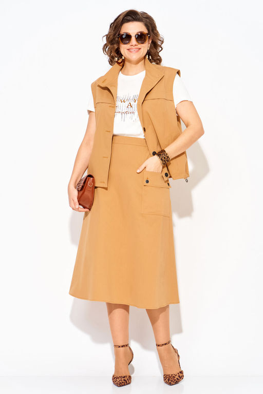 Модный женский костюм из джинсы идеально подойдет для создания стильного образа. Этот костюм включает жилетку в стиле оверсайз на юбку-А-силуэта, что делает его универсальным вариантом для повседневных прогулок! Жилетка на шелковой подкладке с боковыми карманами в рельефах. Воротник стойка с центральной застежкой на петли и пуговицы с подбортом. Низ жилетки можно присборить на кулиску. Юбка в костюме на притачном поясе, в боковых участках вставлена резинка. Юбка с накладными карманами; застежка молния в среднем шве спинки. Джинсовый костюм с юбкой это универсальная одежда для повседневной жизни, отдыха и прогулок. Он подходит для женщин разных возрастов и типов фигур, позволяя каждой представительнице прекрасного пола выглядеть стильно и чувствовать себя уверенно.