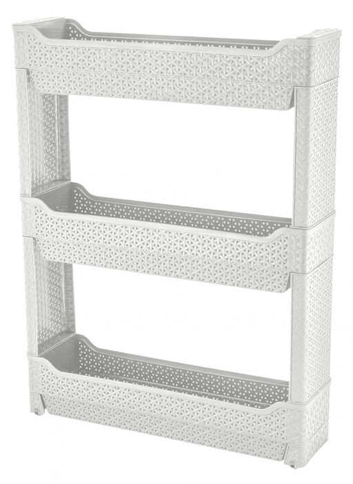Длинные полки с высокими бортиками позволяют бережно хранить различные предметы, а ролики в основании обеспечивают легкий доступ к содержимому при ограниченном пространстве достаточно ее потянуть и выдвинуть или поставить обратно. Этажерка пластиковая состоит из трех секций, высота в собранном виде 69 см, как раз на уровне пояса. Эта дизайнерская этажерка входит в коллекцию Wenge, все изделия которой выделяются единой фактурой поверхности имитирующей плетение ротанг.