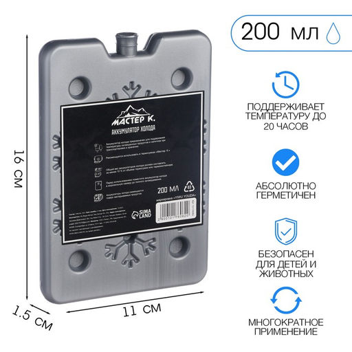 Аккумулятор холода предназначен для поддержания низкой температуры в контейнерах из вспененных материалов, сумках-холодильниках и термопакетах. Он равномерно распределяет холод внутри термосумки, не протекает, обеспечивает долговременное охлаждение продуктов. Термоаккумулятор также используется медицинскими работниками и спортсменами для охлаждения отдельных участков тела при ушибах и гематомах, или для восстановления мышц после интенсивных тренировок. Криопакет актуален для хранения продуктов питания и напитков, когда предстоят продолжительные поездки или же отправка на пикник. А также, хранения лекарств, которые требуют пребывания в прохладной среде. Маленький охладитель прост в использовании: достаточно поместить его в холодильник или морозилку на 8-12 часов. После этого терморегулятор разместить в термосумке, контейнере, сумке-холодильнике, термопакете или аптечке. Количество элементов, необходимых для охлаждения, зависит от объемов аксессуара. На каждые 10 литров необходимо использовать 300-500 мл охладителя. Для отдыха на природе, путешествий на автомобиле, рыбалки, охоты, рюкзака – пригодится в самых разных ситуациях. Для дачи, садового домика, где нет полноценного холодильника, станет незаменимым решением. Длина, см: 16. Ширина, см: 1.5. Время сохранения тепла/холода, ч: 20. Объём, мл: 200. Вид: Твёрдый. Бесплатная доставка: Да.