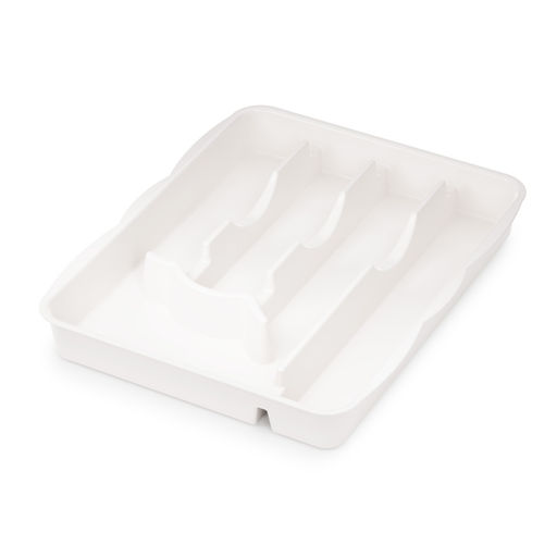 Лоток для столовых приборов изготовлен из прочного и высококачественного пластика. В такой лоток поместится большое количество столовых приборов, при этом они будут упорядочены. Изделие легко достать и помыть в случае необходимости. Лоток имеет пять отделений: три отделения для вилок, ложек, одно горизонтальное для чайных ложек и десертных вилок, одно большое отделение для ножей и остальных приборов.