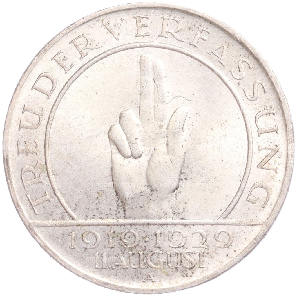 3 рейхсмарки 1929 года A Германия 10 лет Веймарской конституции