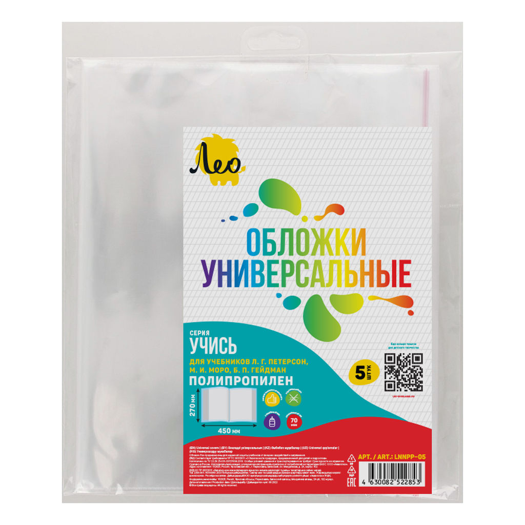 • Лео Учись Обложка универсальная для учебников Моро, Петерсон, Гейдман с клеевым краем LNNPP-05 70 мкм ( 270 х 450 мм) 5 шт. прозрачный