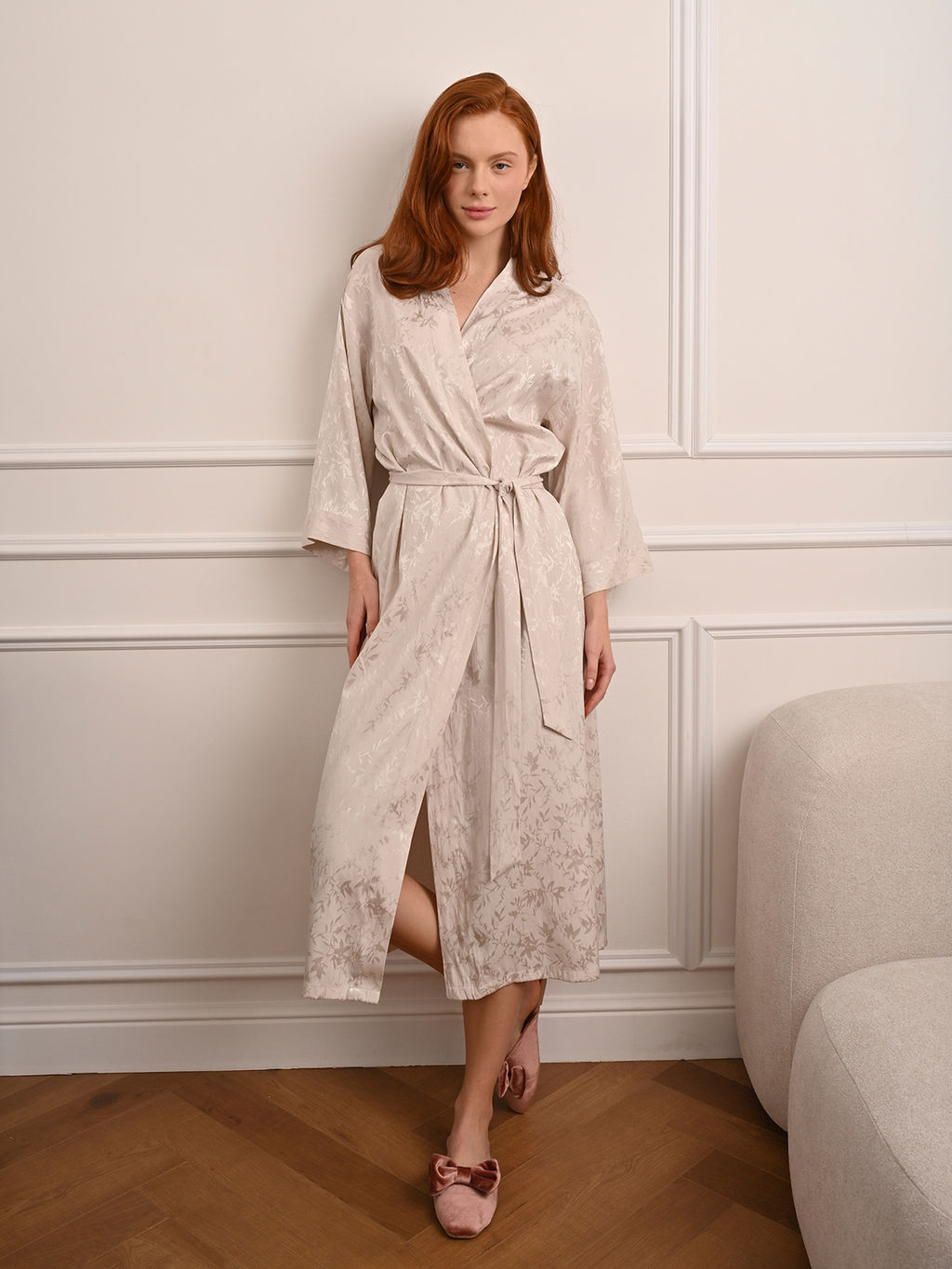 Модель имеет продуманный крой: широкие манжеты, втачной пояс и внутренние завязки гарантируют идеальную посадку, а жаккардовый узор добавляет образу домашнего уюта нотки истинного аристократизма.