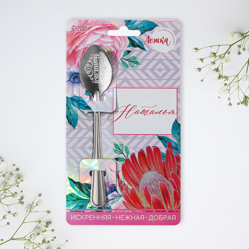 Ложка с лазерной гравировкой и изящной рукояткой преподносится на красочной открытке. На оборотной стороне изделия специально отведено место для подписи: кому и от кого был вручён подарок.