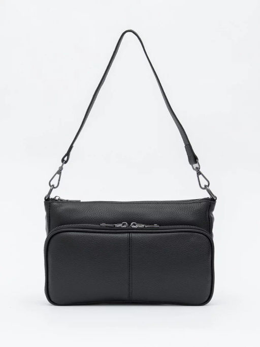 Базовая модель, выполнена из натуральной кожи. Дополнена серебристой фурнитурой. Данная модель закрывается на молнию. Носится в руке или на плече. В комплекте имеется съемная удлиненная ручка и плечевой ремень с регулировкой длины. Каркас полужесткий.