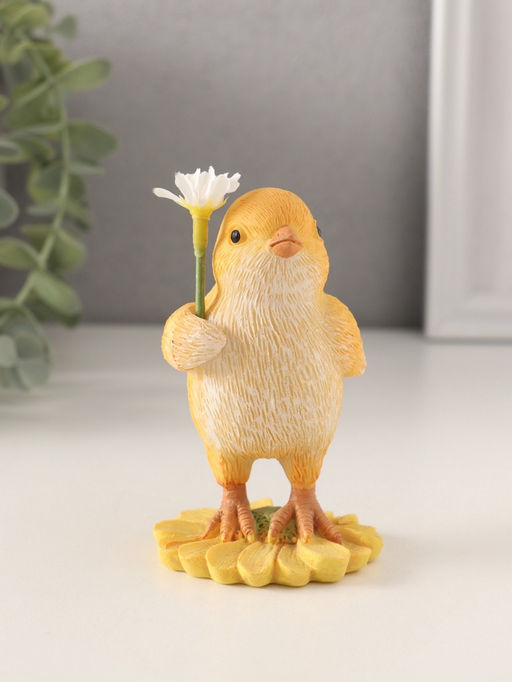 Милый цыплёнок с ромашкой Встречайте милую фигурку, созданную для тех, кто ценит радость и веселье в своем доме Цыплёнок с ромашкой. Эта прелестная композиция из полистоуна размером 5.5x5.5x10 см станет великолепным дополнением к вашему интерьеру и подарит атмосферу беззаботности и счастья. Очаровательный сюжет: фигурка изображает милого цыплёнка, который радостно машет ромашкой. Эта трогательная сцена передает дух радости и веселья, идеально подходящий для детской комнаты или гостиной. Желтый цвет: фигурка выполнена в жёлтом варианте, что делает её настоящим центром внимания. Каждый элемент тщательно проработан, чтобы передать дух радости и веселья. Идеальный размер: с высотой всего 10 см фигурка идеально впишется в любой интерьер, не занимая много места. Она станет прекрасным дополнением к вашим полкам, тумбочкам или подоконникам, добавив нотку веселья и радости. Идеальный подарок: фигурка Цыплёнок с ромашкой станет замечательным подарком для друзей и близких, которые ценят радость и веселье в своем доме. Она также станет замечательным дополнением к вашему личному коллекционированию фигурок, добавив в него нотку беззаботности и радости.