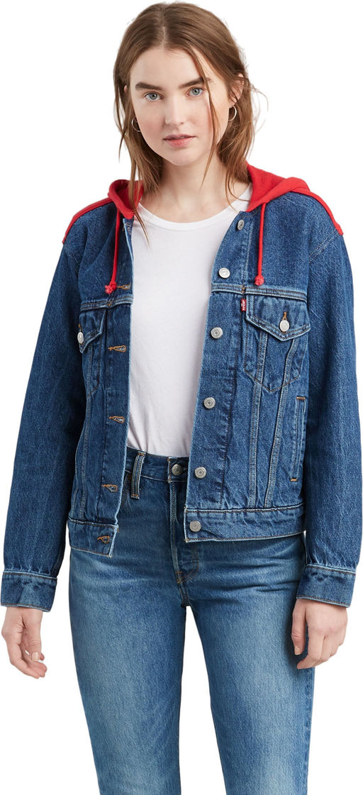 Женская джинсовая куртка с капюшоном в стиле толстовки.