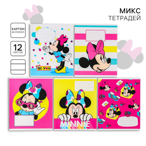 Цена за 10 шт. Тетрадь в линейку 12 листов, 5 видов МИКС, обложка мелованная бумага, «Минни Маус»