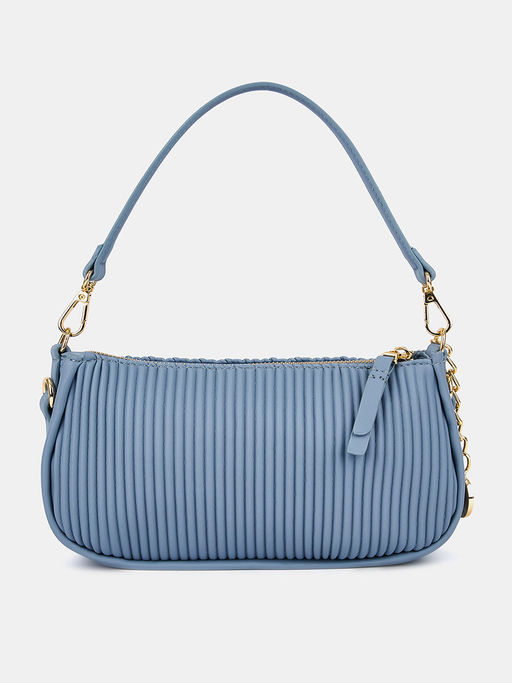 Небольшая женская сумка багет голубого цвета из искусственной кожи. Необычная фактура с мелкими мягкими складками приятно ощущается в руках. Одно основное отделение на молнии позаботится о безопасности вещей, внутри есть открытый и закрытый карманы для карт и ключей. Подкладка из плотного полиэстера надолго сохранит свой вид.
