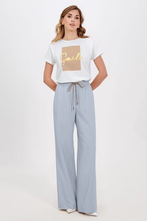 Эта модель из смесовой ткани на основе льна идеально подходит для лета. Широкий крой и удлинённые штанины придают образу непринуждённый вид. Боковые карманы и эластичный пояс со шнуром дополняют комфортный стиль. Брюки можно носить отдельно или дополнить жакетом, вышедшим в той же линейке.­