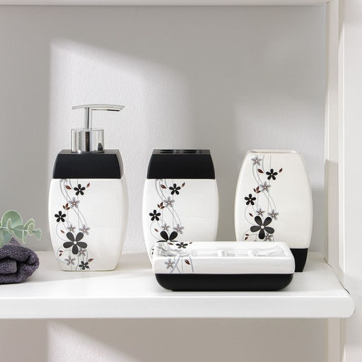 Набор аксессуаров для ванной комнаты «Грация», 4 предмета (дозатор 400 мл, мыльница, 2 стакана), цвет бело-чёрный
