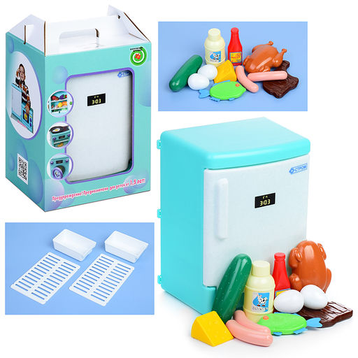 В набор входит: холодильник, яйцо 2 шт, рыба, курица, сосиски 2 шт., молоко, сыр, огурец, стейк, кетчуп.