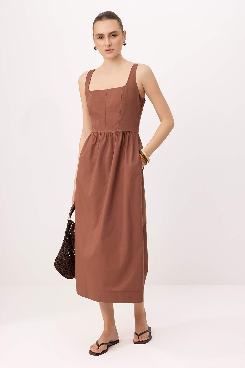 • Kahverengi Belden Ac?lan Midi Korse Dikis Detayl? Midi Dokuma Elbise TWOSS24EL00038