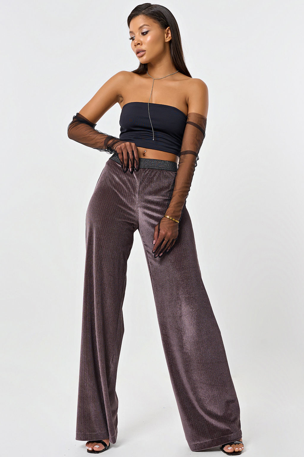 Описание: Брюки прямого силуэта из трикотажного бархата в рубчик. Детали: притачной пояс из декоративной резины. Без застежки.
