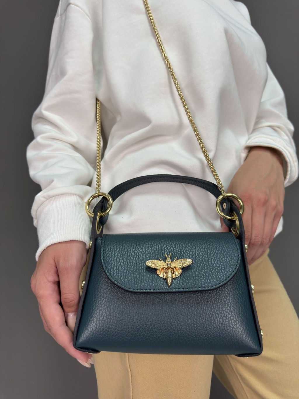 Страна: Италия Акции: Товары со скидкой Производитель: Pelletteria Luisa, Italy Размер: маленькая Стиль ношения: на ремешке через плечо Форма: жесткая Выделка кожи: зернистая износостойкая Цвет кожи: Бирюзовый Оттенок: темно-бирюзовый Палитра цветов: TB-101028 Размеры: длина: 18 см \tвысота: 12 см \tширина: 6 см \tвысота ручки: 9 см \t Описание: Красивая аккуратная необыкновенно модная женская сумка из натуральной кожи. Базовая коллекция Sefaro, Италия. Главные особенности модели: кросс-боди, замок в виде золотой бабочки, съемный плечевой ремень-цепочка, а также заклепки на боковых стенках сумки - используется фурнитура высокого итальянского качества в золотом цвете. Все эти элементы непременно привлекут к вам внимание окружающих своей яркостью и оригинальностью исполнения. Сумочка имеет каркасную форму, компактная, выполнена из зернистой телячьей кожи надежной и прочной в носке, может использоваться как повседневная модель, но подойдет и для торжественного случая - элегантно дополнит вечерний образ по типу клатча, либо подчеркнет сдержанный деловой, классический или даже винтажный стиль. Закрывается сумка внахлест на элегантную застежку с пряжкой, внутри один отдел, в котором поместится только самое необходимое. На дне сумки металлические защитные ножки. Можно носить в руке, на запястье, либо на изящной цепочке через плечо (длина 120см) - очень удобно!