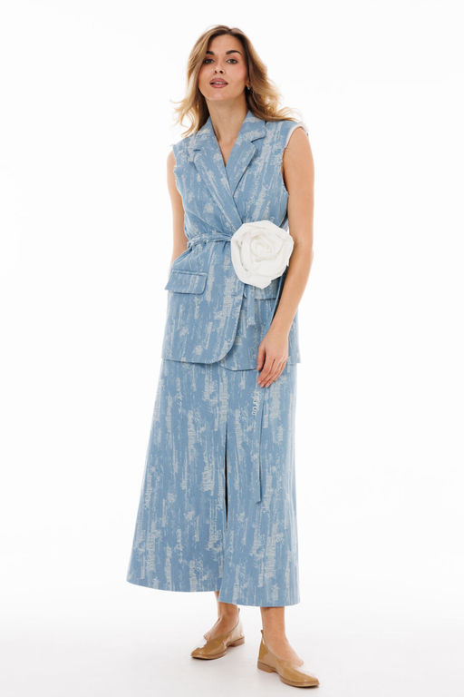 Состав: ПЭ-22%; Хлопок-76%; Эластан-2%; Стильный гармоничный комплект, состоящий из жилета с обработкой проймы открытым срезом и юбки А-силуэта с разрезом спереди. Жилет прямого свободного силуэта на контрастной подкладке. Пройма рукавов обработана современным приемом: открытым срезом и зафиксирована дополнительной строчкой в качестве отделки. Английский отложной на стойке воротник, застежка однобортная фронтальная петли/пуговицы в области линии талии с закругленными бортами. На полочке расположены горизонтальные прорезные фигурные карманы с клапаном. Спинка жакета имеет средний шов. Детали кроя имеют рельефный бочок для удачной посадки изделия. Длина изделия по среднему шву спинки 71-73 см в зависимости от размерного ряда. Юбка А-силуэта, с наклонными карманами спереди. Передняя часть юбки состоит из двух деталей со средним швом по центру изделия, в котором расположен открытый разрез-шлица, высотой 42 см. В среднем шов спинки расположена застежка-потайная молния. Юбка оформлена притачным поясом, высотой 4,5 см и шлевочными элементами для возможной фиксации объема обхвата талии. Длина юбки по среднему шву 83 см. Дополнительно в комплекте присутствует съемные: текстильный пояс и декоративная брошь: в виде цветка контрастного тона. (фурнитура может отличаться от представленной на рекламном фотоматериале) Особые рекомендации: рекоменду тов холодная деликатная ручная стирка, без использования отбеливающих СМС, Без интенсивного трения. Сушка в вертикальном положении. ВТО с минимальным паром. -- Характеристики -- Состав: ПЭ-22%; Хлопок-76%; Эластан-2%; Сезон: Весна Рост: 164 Страна бренда: Беларусь