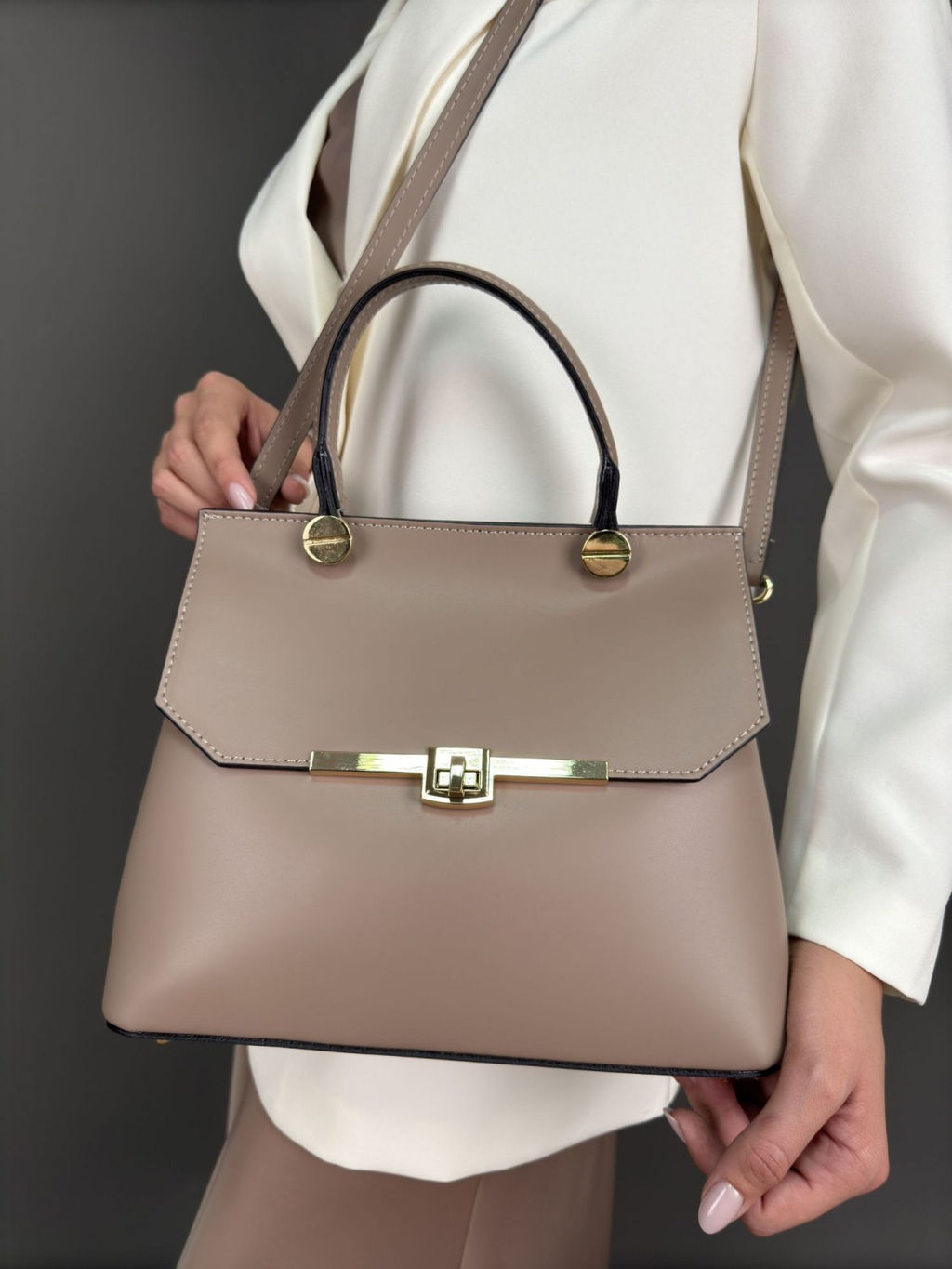 Страна: Италия Акции: Товары со скидкой Производитель: Pelletteria Luisa, Italy Размер: средняя Стиль ношения: короткие ручки в руках Форма: жесткая Выделка кожи: гладкая матовая Цвет кожи: Бежевый Оттенок: темно-бежевый Палитра цветов: TB-307708 Matte Размеры: длина: 27 см \tвысота: 23 см \tширина: 12 см \tвысота ручки: 10 см \t Описание: \t Элегантная женская сумка из натуральной кожи, производство Италия. Коллекция Весна-Лето 2023, Sefaro. Небольшая стильная сумочка жесткой каркасной формы, выполнена из телячьей кожи шелковистой гладкой матовой выделки Matte. Украшением модели служат большие болты-крепления ручки и изящная пряжка-застежка на лицевой части. Сумка легко сочетается с вещами в стиле Casual, будет органично смотреться в классическом, деловом либо повседневном образах. Закрывается внахлест на защелку, внутри 2 отделения, разделенных карманом-перегородкой на молнии, на боковых стенках имеется 1 карман на молнии и 2 накладных тканевых кармашка для мелочей. Внутренняя отделка сумки - качественная, водоотталкивающая, приятная на ощупь и долговечная в использовании, ткань. В модели используется качественная итальянская фурнитура в золотом цвете. На дне сумки имеются защитные металлические ножки. В комплекте идет плечевой кожаный ремешок, длиной 95см. Сумку удобно носить в руках, на запястье или на плече очень практично и комфортно! Внутренняя отделка сумки - качественная, водоотталкивающая, приятная на ощупь и долговечная в использовании, ткань.